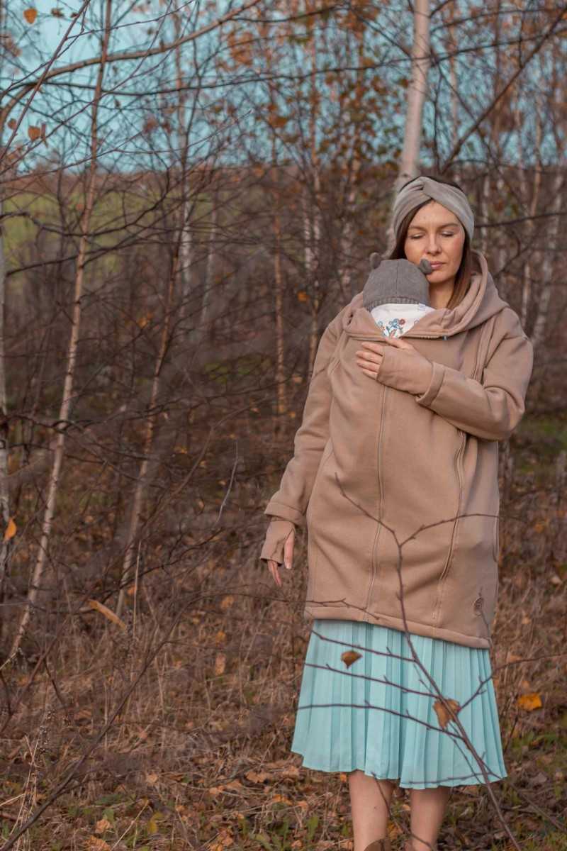 SZEROKI: idealny podczas ciąży i noszenia dziecka. Oversizowy kaptur to także idealne połączenie, gdy chcesz nosić dziecko z tyłu. Zapięcie na drugi zamek poszerza płaszczyk o około 2o cm.