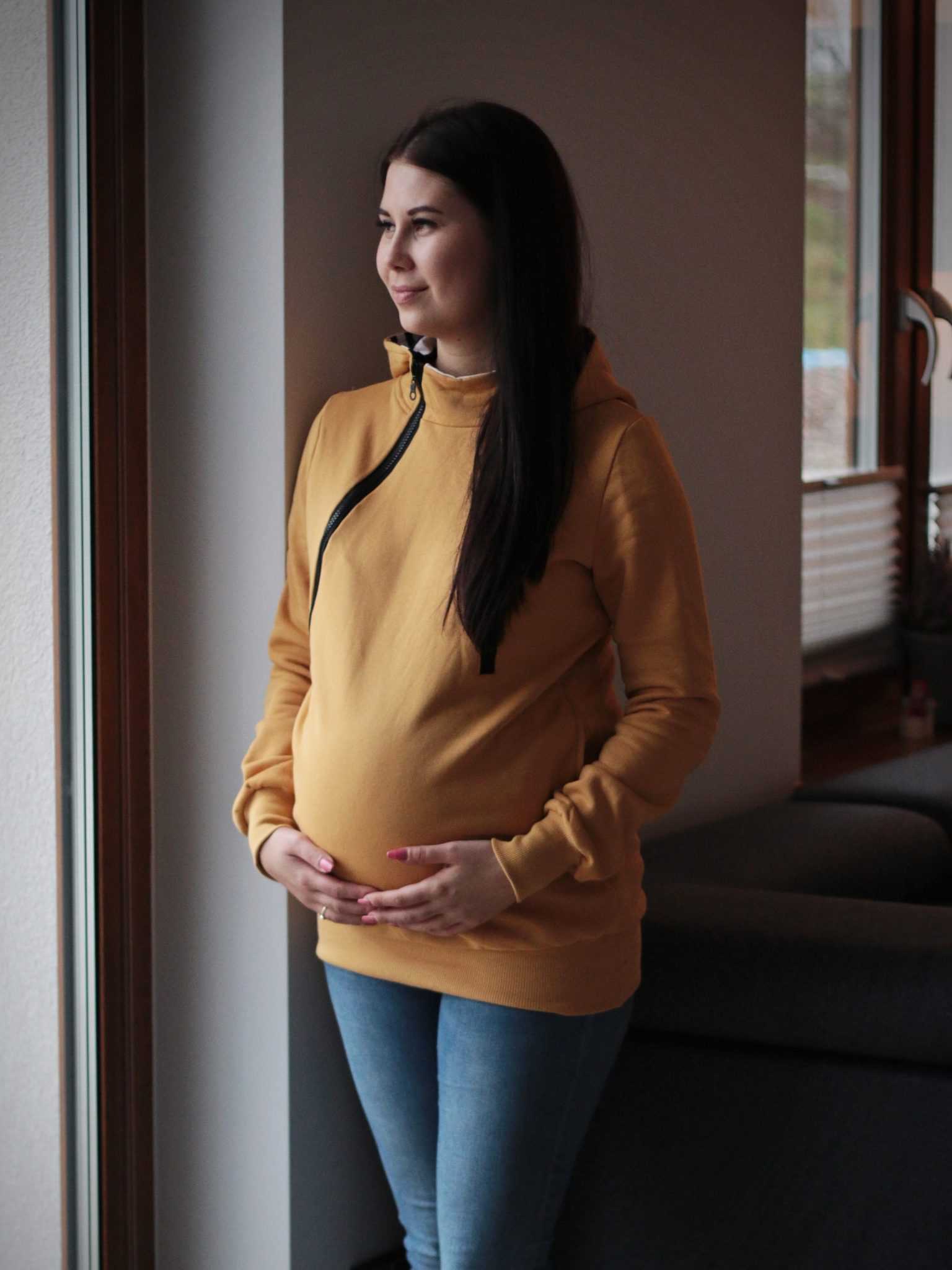 Specjalnie zaprojektowana bluza dla przyszłych mam, do wykorzystania na trzy sposoby: podczas ciąży- unikalny krój sprawia że bluza dostosowuje się do zmieniającej się sylwetki, po ciąży ułatwi karmienie poprzez specjalnie zaprojektowane zamki, oraz jako normalna bluza na co dzień.